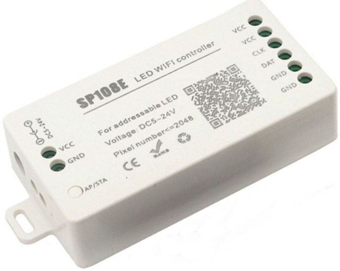 Ovladač digitálních RGB LED pásků WS2811, WS2812B, SK6812, UCS1903, TM1804 atd. Tento kontrolér se ovládá přes aplikaci pro chytrý telefon, tablet (Android i iOS-aplikace LED Shop). Disponuje režimemSTA, kdy se přihlásí do Vaší WiFi sítě a můžete ho ovládat přes internet odkudkoliv nebo se můžete přes WiFi připojit přímo k ovladači (režim AP). K dispozici je více než 180 dynamických režimů a 8 statických režimů. V aplikaci je možnost vytvoření vlastních efektů na základě obrázku. Možnost regulace jasu a rychlosti efektu. Ovládání až 2048 pixelů. Vstupní napětí je 5-24V DC, je potřeba použít správné napětí pro daný typ LED pásku. Podporuje pouze 2,4 GHz sítě. Jedná se o novější, aktualizovanou verzi ovladače.